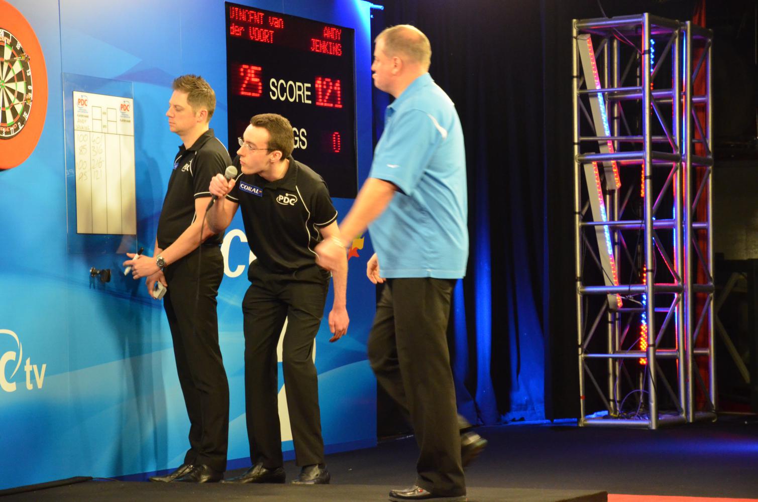 Nein, ich habe nie einen Neun-Darter gecallt, es war so etwas wie ein Running Joke zwischen mir und den anderen BDO Schiedsrichtern, das ich das nicht hatte. Ganz lange hatte ich noch nicht einmal sechs perfekte Darts und konnte noch nicht einmal rufen "Du brauchst 141". Das änderte sich 2015, da warf Jeff Smith erst 171 und dann 180, also habe ich jetzt zumindest sechs perfekte Darts. Selbst wenn ich tatsächlich auch in diesem Fall nicht "Du brauchst 141" rufen konnte.