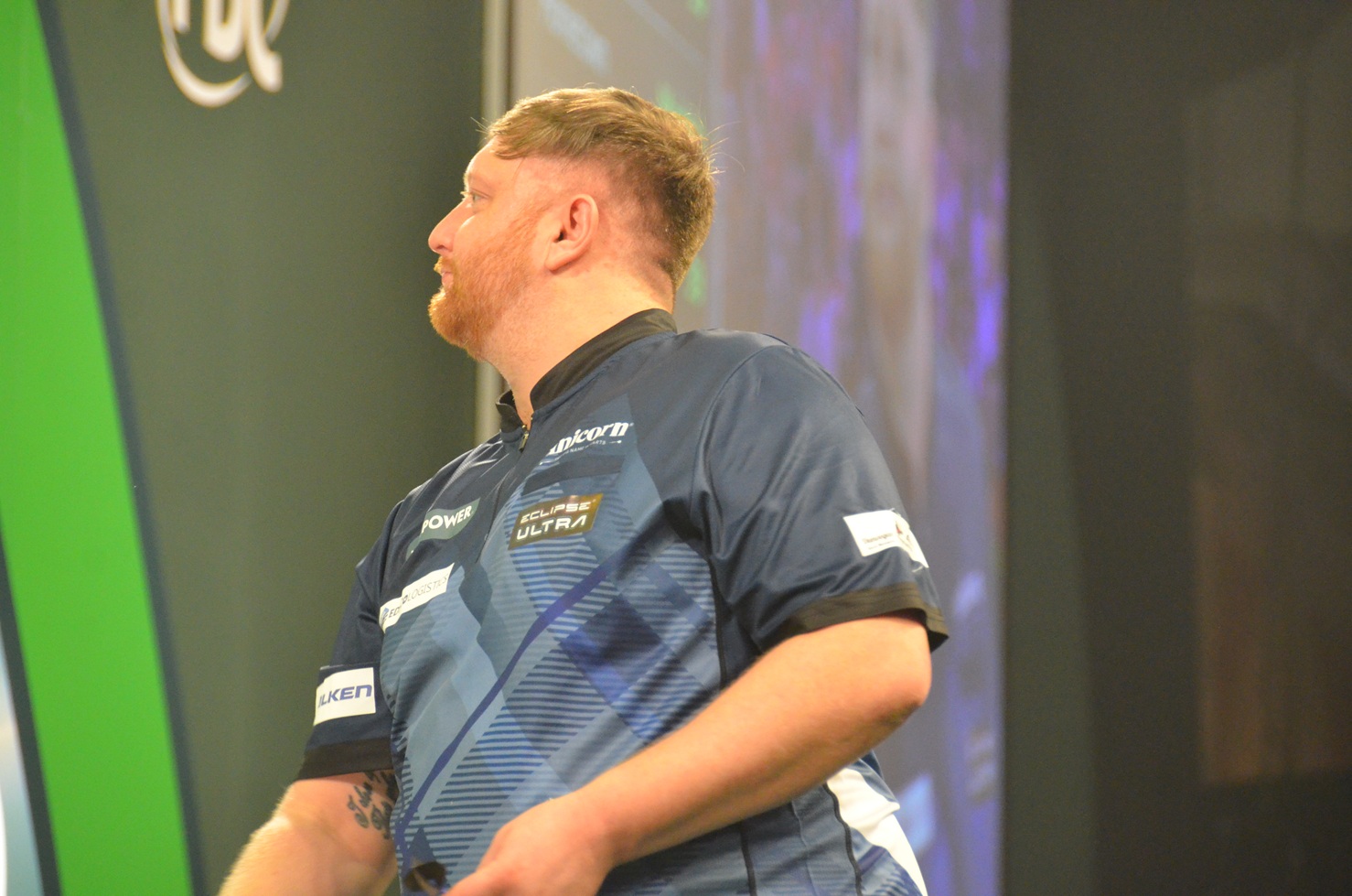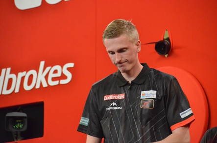 seiner Nervosität überwältigt, dauerte es viel zu lang, bis er sich einigermaßen in den Griff bekam, was sich auch darin niederschlug, dass er sich bei einer Restpunktzahl von 178 Punkten mit einer 180 überwarf. Er hatte keine Chance gegen Danny Noppert.