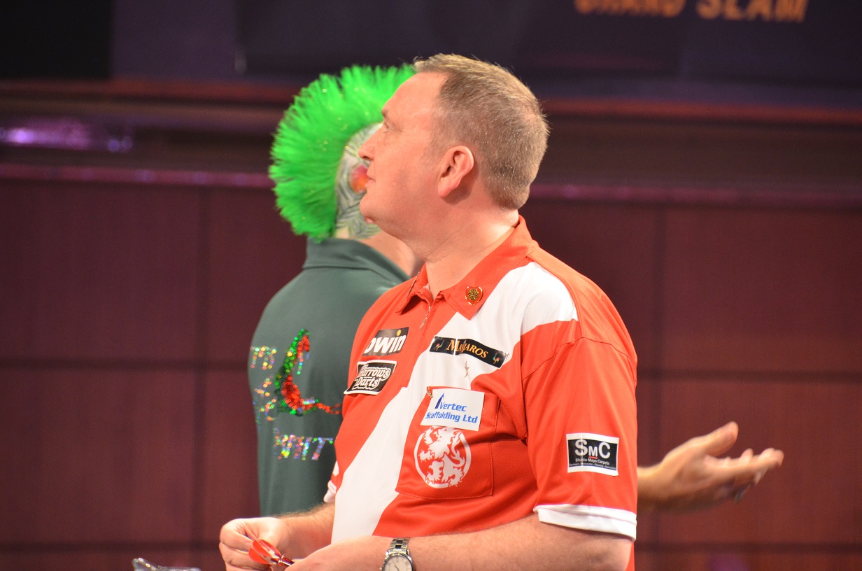 Zum Abschluss des Nachmittags kam dann mit Glen Durrant der amtierende BDO Weltmeister auf die Bühne. Er zeigte sich vollkommen unbeeindruckt, hat aber ja auch schon Grand Slam Erfahrung. Peter Wright hatte wieder einmal Schwierigkeiten und ließ sich von Durrants Leistung verunsichern. Er verlor mit dem zweithöchsten Durchschnitt des Nachmittags und Glen Durrant konnte als bisher einziger BDO Spieler sein erstes Spiel gewinnen.