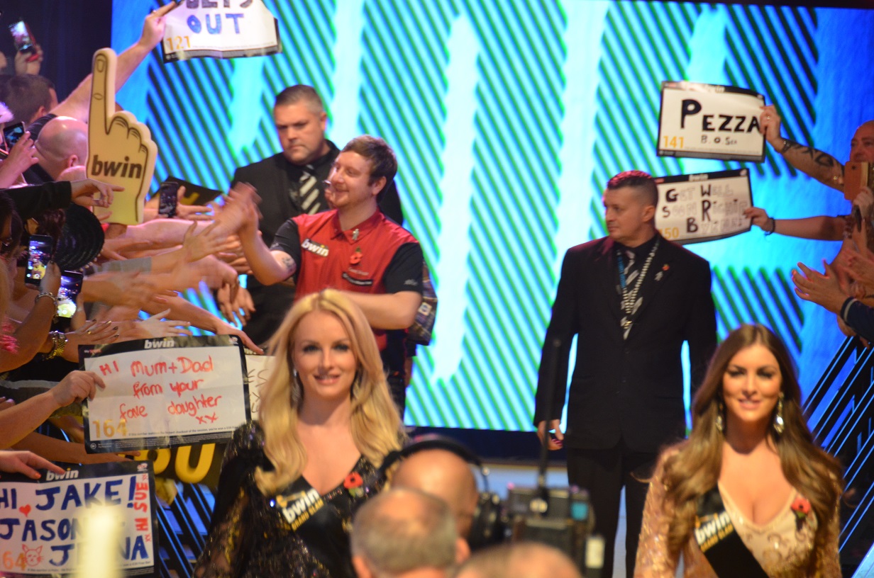 Mit leichter Verspätung wurden sie auf jeden Fall kurz nach 12 aufgeschlossen und die ersten Zuschauer drängten in die Halle. Manche kauften sich ein Programm, ein paar waren mehr an Peter Wright Perücken interessiert und leuchteten kurz darauf in blau, rot und gelb. Nachdem man ausführlich meine Essensvorräte begutachtete hatte, machte ich mich auf die Suche nach dem Press Room, der bereits mit Kommentatoren und PDC Leuten gut gefüllt war. Sehr lange dauerte es nicht mehr, bevor John McDonald Michael Smith und James Wilson zum ersten Spiel auf die Bühne holte.