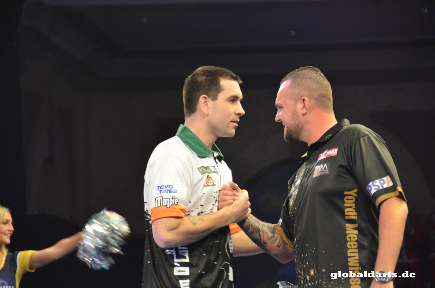 Der Nachmittag ging mit zwei irischen Spielern und zwei irischen Siegern weiter. Zuerst trat der Ire William O'Connor, der sich wie sein nordirischer Kollege Brendan Dolan über den Pro Tour Order of Merit qualifiziert hatte, gegen den Sieger des Westeuropäischen Qualifikationsturniers Yordi Meeuwisse an. O'Connor hatte schon ein paar Mal an der PDC Weltmeisterschaft teilgenommen, aber seine Auftaktspiele bisher immer verloren. Dieses Mal lief es besser für ihn. Er hatte einen guten Start und holte sich das erste Set mit 3:1. Die beiden folgenden Sets dominierte er nicht mehr so und beide Sets gingen in ein Entscheidungsleg, dass aber beide Mal der Ire für sich entscheiden konnte.
