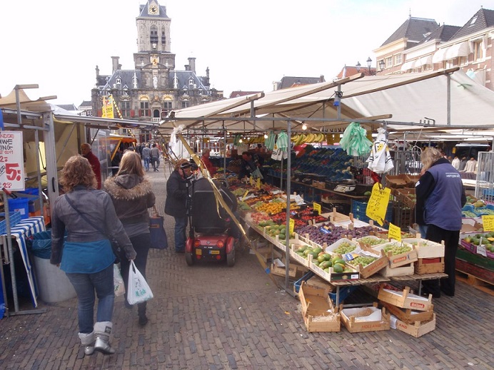 Ich stopfte Laptop, Kamera und natürlich Darts in meinen Rucksack und trat in den wunderbar blauen Tag hinaus. Gänse und Enten schnatterten im schmalen Kanal vor dem Hotel Eingang. Im Labyrinth gepflasterten Gassen, Brücken und verborgenen Ecken der Stadt, das sich zwischen den alten, roten Backsteinhäusern entlangschlängelte, herrschte emsiges Treiben. Ich wand mich nach links und bewunderte die Schaufenster, dann ging ich nach rechts über eine schmale Fuß Brücke, durch einen geheimen Durchgang zwischen den Häusern auf den Marktplatz. Wie das Zentrum eines riesigen Irrgartens breitete sich der Marktplatz vor mir aus, ein großes und massives Rechteck auf allen Seiten von Wänden und Fenstern umgeben. Dazwischen versteckten sich Kirchen, das Rathaus, der Glockenturm und ein kleinerer Irrgarten aus weißen Zelten stand mittendrin. Dort gab es alle Arten von Essen, Grundnahrungsmitteln, absolut Notwendigem und Textilien, die der normale Delfter Bürger brauchen könnte.