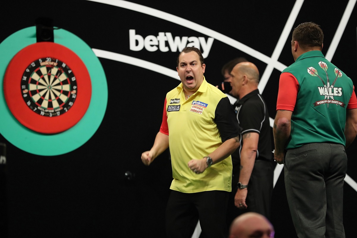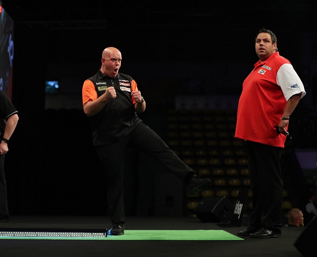 Van Gerwen konnte im ersten Einzel Gerwyn Price mit 4:0 schlagen, aber anschließend verlor Raymond van Barneveld mit 1:4 gegen einen überzeugenden Mark Webster. Im Doppel zeigten sich die beiden Niederländer überlegen und gewannen mit 4:1. Da für den Sieg aber drei Punkte notwendig waren, musste van Barneveld noch einmal zurück ans Oche und besiegte Price mit 4:1.