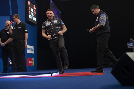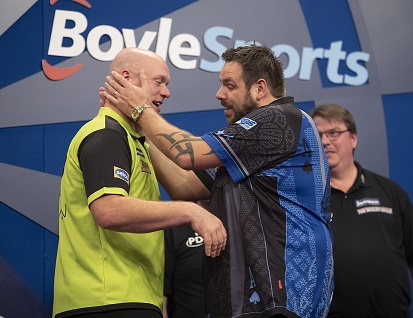 Im zweiten Viertelfinale des Abends schoss van Gerwen aus den Startblöcken und ging mit einer 4:1 Führung in die erste Pause. Anschließend zog er auf 8:2 davon und warf dabei eine 132 Finish. Nach der zweiten Pause leistete Lewis zunächst mehr Widerstand, aber ein Durchschnitt von 86.28 war einfach zu wenig um mit dem Niederländer, dessen Durchschnitt bei 103.05 lag, mithalten zu können. Gleich nach seinem Sieg richtete van Gerwen seine Aufmerksamkeit auf sein morgiges Viertelfinale gegen Gerwyn Price, der in den bisherigen gemeinsamen 19 Spielen kein einziges Mal gewinnen konnte.
