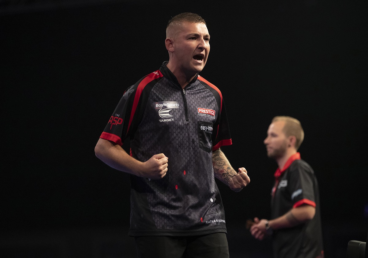 Der Niederländer Noppert, der in der ersten Runde Daryl Gurney geschlagen hatte, hatte einen sehr schlechten Start ins Spiel. Im ersten Leg brauchte er 17 Darts um das eröffnende Doppel zu treffen. Aber er erholte sich und konnte das Set gewinnen nachdem Aspinall drei Darts auf die Doppel vergeben hatte. Aspinall antwortete und holte sich Set zwei ohne ein Leg abzugeben. Das dritte Set ging dann mit 3:1 wieder an den Niederländer. Set vier sicherte sich Aspinall mit einem 88 Finish. Im fünften Set gelang Noppert nicht mehr allzu viel und er konnte kein einziges Leg mehr gewinnen, so dass Aspinall unter die letzten Acht einziehen konnte.