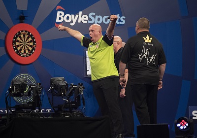 Van Gerwen konnte sich Set 1 schnappen, nachdem King zwei Darts auf die Doppel verworfen hatte. King gewann das zweite Set und konnte ausgleichen. Beide Spieler warfen im Set ein 170 Finish. Das dritte Set ging wieder mit 3:1 ein van Gerwen. King antwortete und sicherte sich das erste Leg des vierten Sets mit einem tollen 132 Checkout. King dominierte weiter in Set zwei, aber dann verwarf er einen Darts auf den Setgewinn und van Gerwen ließ sich die Chance nicht entgehen und glich zum 2:2 aus. Im entscheidenden Leg hatte der Niederländer die Nase vorne und holte sich mit der Doppel 20 den Sieg.