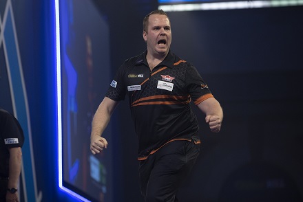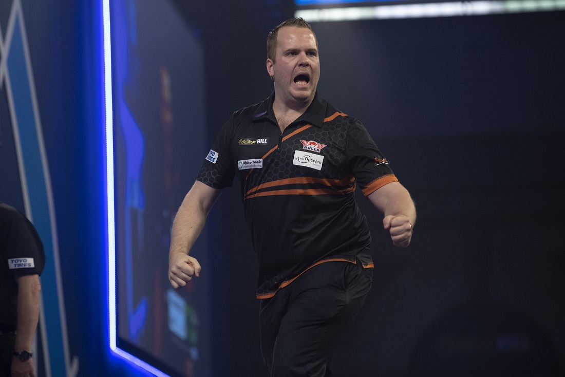 World Grand Prix Finalist Dirk van Duijvenbode zog mit einem 4:0 Sieg über Adam Hunt unter die letzten 16 ein, obwohl Hunt neun Mal die 180 traf.