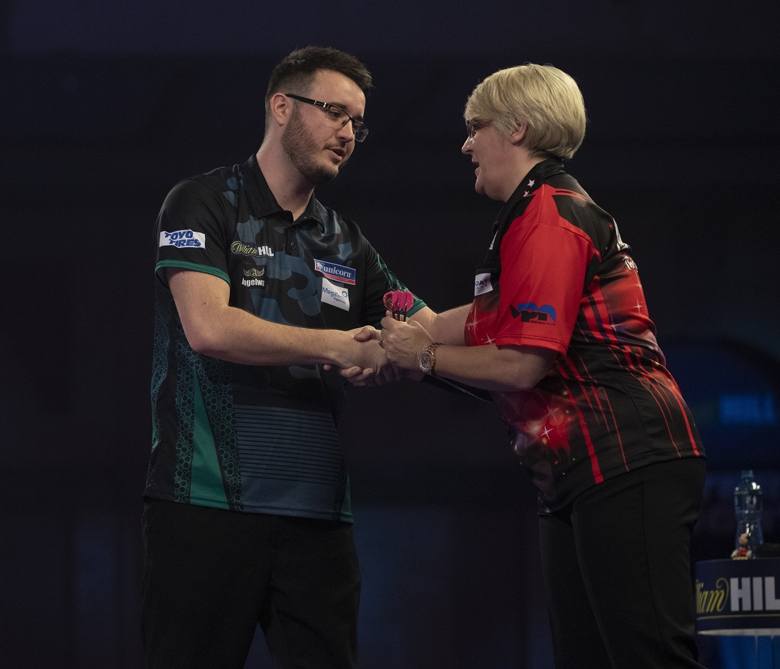 Nach einem Bullseye Finish zum Gewinn des ersten Sets schien Ashton schon in die Fußstapfen von Fallon Sherrock treten zu wollen, die im letzten Jahr als erste Frau, die Spiele auf der Bühne des Alexandra Palace gewinnen konnte, Geschichte schrieb. Aber Hunt gab nicht nach und holte sich die nächsten beiden Sets. Das vierten Set holte sich die viermalige Damen Weltmeisterin mit einem tollen 11-Darter im fünften Leg und erzwang damit ein Entscheidungsset. Dort überwarf sie sich im dritten Leg beim Versuch ein 130 Finish zu werfen und Hunt konnte sich das Leg schnappen bevor er im nächsten Leg die Nerven behielt und mit einem 120 Finish alles klar machte.
