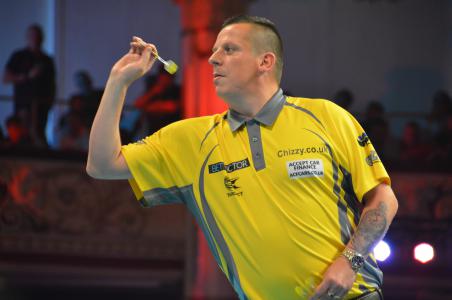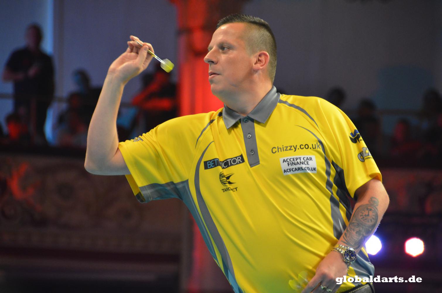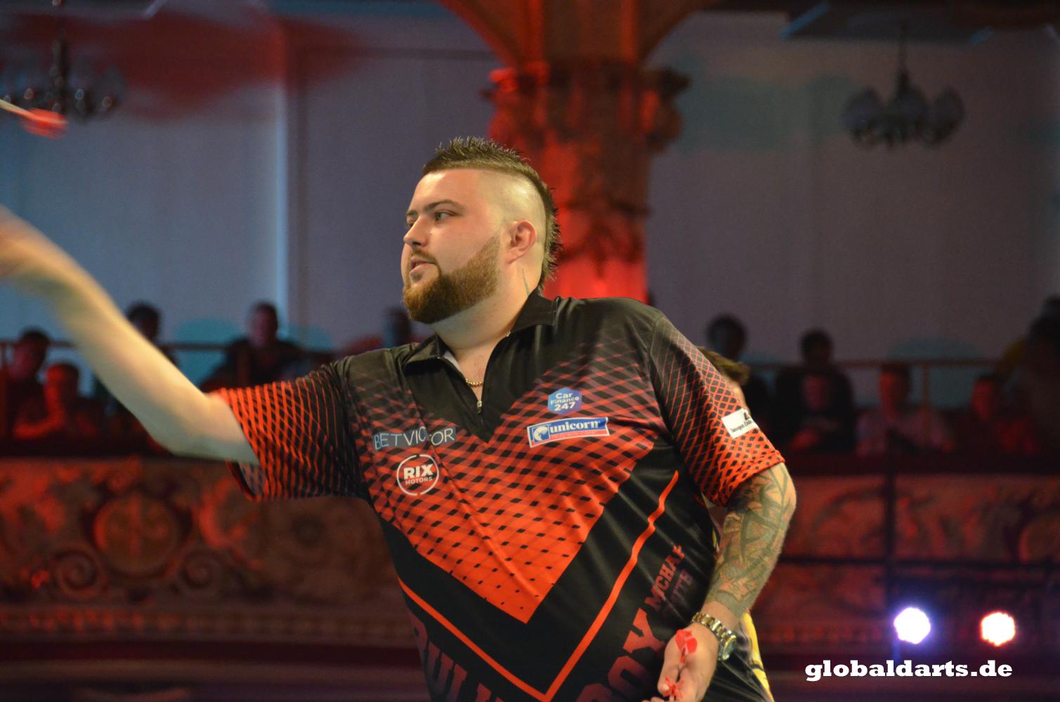 In the second match Dave Chisnall and Keegan Brown stood at the oche and it was only a close match for the first few legs. Then Brown couldn't keep up any longer while Chisnall played a decent match. Browns average in the end was below 80 - just not enough . Not even viewing against heaven or rather to the ceiling of the Empress Ballroom did help him. When Brown threw his last few darts frustrated into the board he even was booed by the crowd...