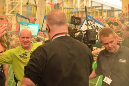 An upset to be sure was the elimination of Raymond van Barneveld, who had played great the day before, but nothing worked out on the day. Dave Chisnall lost to Stephen Bunting, Robert Thornton to the surprising Eddie Dootson who himself lost in fifth round to Devon Petersen. Andrew Gilding went on to make his circles and Jelle Klaasen and James Wade were his victims of the day. The match totally passed him. Wes Newton was eliminated as were Andy Hamilton and Kim Huybrechts and Vincent van der Voort and at the end of the day not surprisingly looking at their performances Michael van Gerwen and Phil Taylor were the last of the really to top players, Stephen Bunting, Mervyn King and Peter Wrights were the ones one had thought of capable to survive though King only just made it with three 9:8 wins. Beside those we had crowd favourite Devon Petersen and - as always in the UK Open - the surprises, this time Mensur Suljovic and Andrew Gilding. As the last mentioned were drawn against another one of them even will reach the semi-finals...