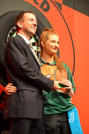 The girls played first, to be sure at least for the only ten years old Beau Graves, who only plays darts for a few months an enormous challenge which she coped with astonishingly. But she was no match to the seven year older Robyn Byrne. In the boys match the rate was more even, they were 15 and 16. Dutch Colin Roelofs nevertheless let Callan Rydz no chance, he just dominates the boy's scene at the moment. It was a fast and high class final and over in no time. Callan Rydz didn't look happy with his second place while Colin Roelofs was all smiles.