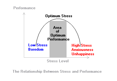 In the middle, at a moderate level of stress, there is a zone of best performance. If you can keep yourself within this zone, then you will be sufficiently aroused to give a high quality performance, while not being over-stressed and unhappy.