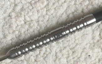 Let's take a look at the darts in some detail. The darts come fitted with a standard silver steel-tip point that leads up to a very gradual bull nose. This is designed to minimise impact damage to flights and the barrels grip as well as reducing deflections to allow for tighter groupings. The main barrel itself is a straight barrel dart with 2 grip regions separated by a smooth band containing the DPC laser etching just beyond half way along the barrel.