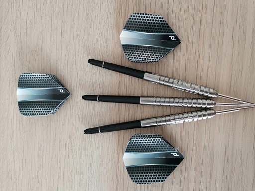 Inside the outer packaging you get a hard plastic case that contains the 3 darts in a point protector, a set of inbetween length black nylon stems and a set of the new standard size Performance Darts flights, which have a nice design, feel quality and contain the pd logo.