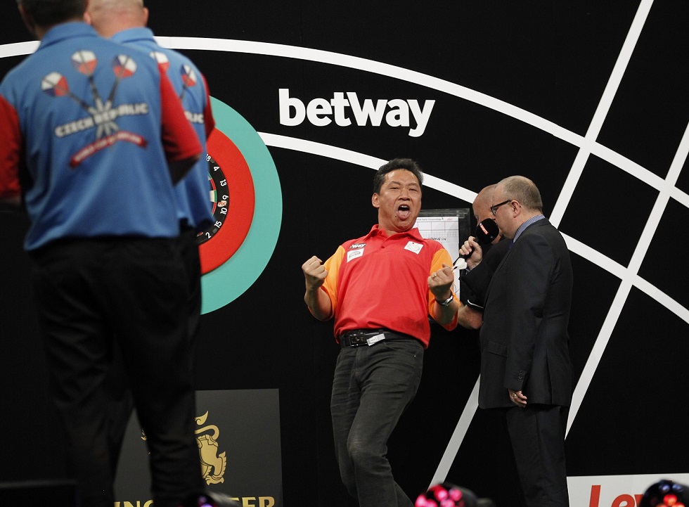 The reigning champions now meet China in round two, after debutants Yuanjun Liu and Wenge Xie knocked out Czech Republic pair Michal Kocik and Pavel Drtil 5-3, leading 3-0 before seeing their rivals level, only to take the next two legs as Liu's 100 finish secured a first World Cup win for their nation.