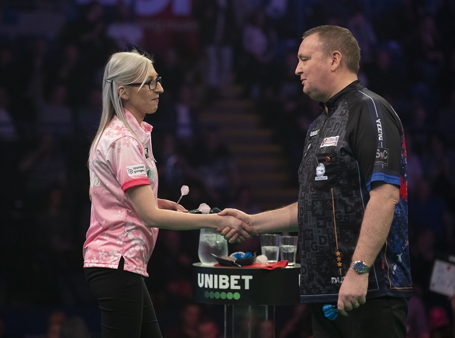 Sherrock, who became a global sensation at Alexandra Palace in December by becoming the first woman to win matches at the World Championship, picked up where she left off at a packed out Motorpoint Arena.
