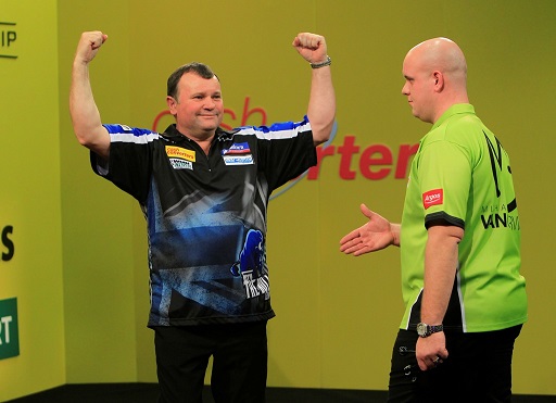 Die Nummer 1 der Welt van Gerwen hatte letztes Jahr im Finale Taylor geschlagen und hatte seine Titel Verteidigung mit einem herausragenden Sieg über Raymond van Barneveld begonnen. Aber in seinem zweiten Spiel wurde er von Jenkins einfach ausgespielt - der 51jährige rächte sich für seine Niederlage gegen den Niederländer im Finale der European Championship im Oktober.