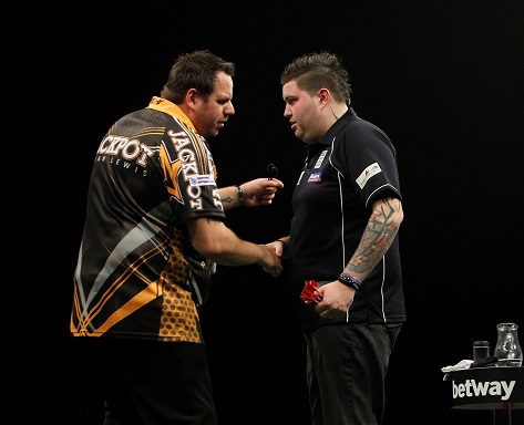 Der Premier League Sieger von 2009, James Wade, beeindruckte mit einem tollen Comeback von einem 0:3 Rückstand gegen Michael van Gerwen - er holte sich noch einen 7:4 Sieg. Auf seinem Weg zur frühen Führung hatte der Niederländer ein 167er Finish geworfen. Aber dann strafte ihn Wade für seine Fehlwürfe auf die Doppel ab. Van Gerwen konnte mit einem 70er Finish noch einmal auf 4:5 herankommen, aber Wade stellte mit einem 121er Finish seinen alten Vorsprung wieder her und beendete dann nach seiner fünften 180 das Spiel mit einem 81er Bullseye Finish.