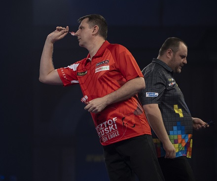 Krzysztof Ratajski put on an excellent display to race past Ryan Joyce in straight sets, averaging over 100 in the process.
