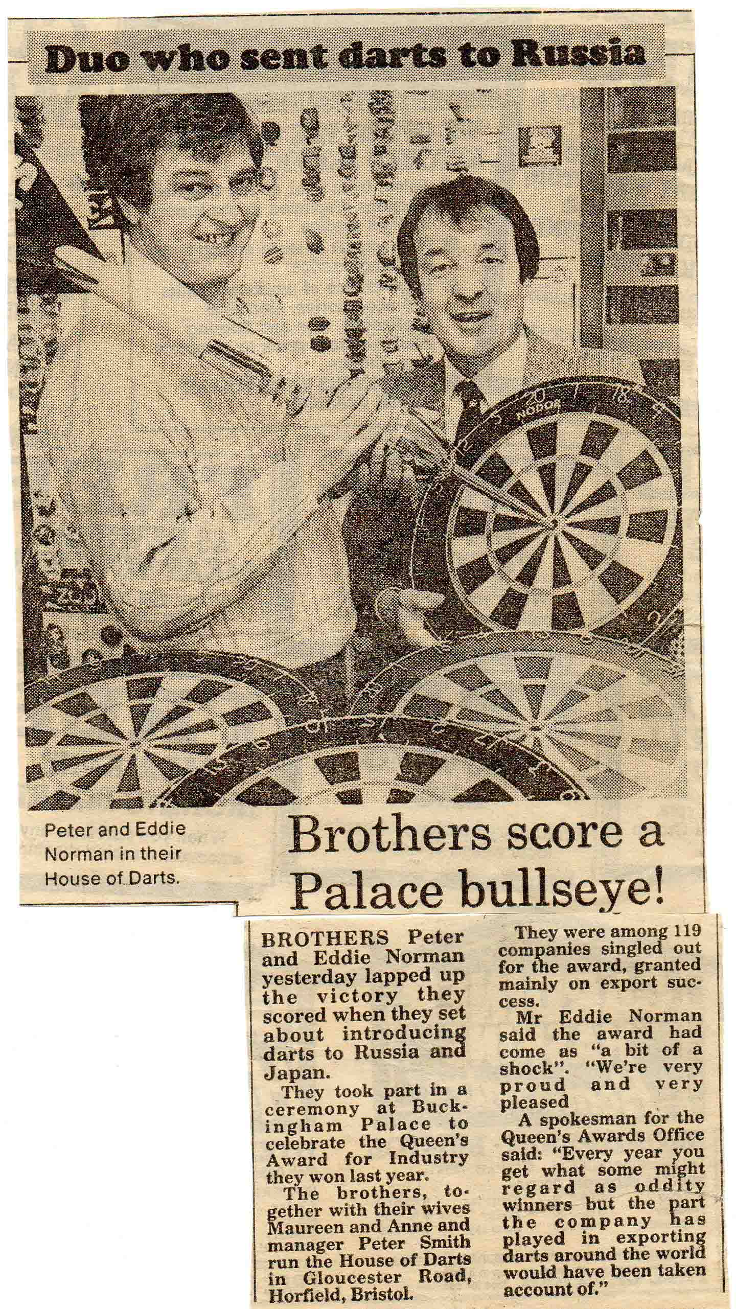 Some of his agents called their shops "House of Darts" as well. In Amsterdam till today a "House of Darts" exists though the owner has changed many years ago and several times. In Finland, Belgium and Sweden once existed a "House of Darts" as well. In German Norman supplied agents in Munich, Frankfurt, Erlangen, Hamburg and other towns. Beside of course you could find independent dart dealers like Bob Ryan in Neu-Isenburg who was the first German darts wholesaler as well with own contacts to English dart companies. Eddie Norman still remembers dart dealers like Ryan were Joe Scott in Heidelberg who run his shop together with some Americans from the US Army - but who as it looks came in conflict with the law and returned to England where he passed away some years ago -and Welshman Peter Lewis in Munich - who sold as Dieter Schutsch remembers Darts videos with the Top players of the 1980s as well and organised exhibitions. The Bavarian Darts Centre doesn't exist anymore, but 180Darts continues with Peter's son David, who as well produces custom made darts.