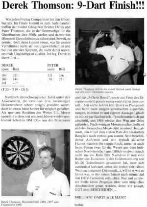 The first nine-darter in German threw 1988 Scotsman Derek Thompson who was the Hessen champion in 1986, 87 and 88. He started to play DDV events in 1988.
