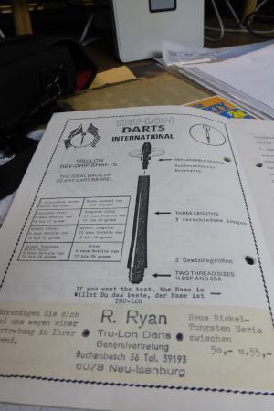 In the end Bob Ryan chucked his job on the airbase and became the first darts wholesaler in Germany. He often travelled to Great Britain, cultivated his contacts to Trulon, of whom Ryan remembers that the company was the first to produce tungsten darts, stocked up on dartboards at Winmau or Nodor and looked for dart supplies of all kinds. At this time it was not easy - there didn't exist any internet business - not even an internet - and the postage was very high. Ryan was not in contact with Unicorn and can't remember who Unicorn's agents in Germany were. Might be it at this time was the already mentioned Joe Scott. For some years now Dutchman Herman Stiens is the German Unicorn chief agent.