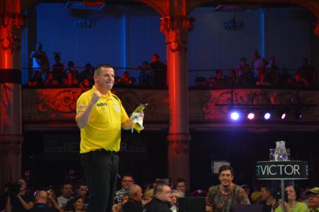 Robert Thornton, born 1967, made himself a birthday present by winning his first round match against Josh Payne and progressing for the first time into the second round. On his birthday he had the day off and had time to celebrate. Thornton plays in the PDC since 2008. He switched from the BDO after he had qualified by a pub qualifier for the UK Open and I still remember when he cam on stage in Bolton for the first time. He looked rather strong and played himself under the top 32 where he lost to Alan Tabern. Nobody still talks about Tabern, while Thornton still is around and is ranked 8 in the PDC Order of Merit. A place among the top 16 of the PDC was targeted by Thornton when he joined and said farewell to his not too successful carer in the BDO. Consistency is not really one of Thornton's strengths, often enough a great performance is followed by a weak one similar to what happened now in the World Matchplay. Nevertheless Thornton is an opponent difficult to defeat. But till now he only managed to win two PDC majors: the UK Open 2012 and the World Grand Prix 2015. Thornton never walks on stage without his little teddy which he places during the matches on the small table on stage. And his wife usually accompanies him as well.