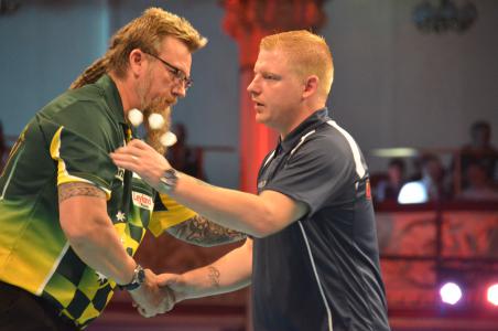 Really one sided was the following match between Simon Whitlock and his friend and debutant Richard North, who couldn't hit much but showed his frustration quite in an expressive manner. When it was 8:0 Whitlock North finally manged to win a leg. And as he enjoyed that so much he threw in the following match three 140s and won it again when Whitlock missed his double. So it least was not a whitewash for the young player but after he had won those two legs he returned to his scores around 40 points and Whitlock won 10:2 - an easy win. Richard North to be sure will not look back with pride at his first World Matchplay appearance..