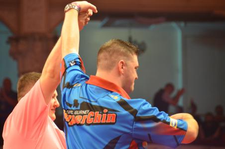 On my last night at the World Matchplay the entertainment started with the match between Daryl Gurney and Keegan Brown. I've no idea what both players did in between their matches - but both started not well into this match and it was an under par match at least till the first break. Besides the players had a lot of trouble hitting their doubles.Gurney went with a 4:1 lead into the first break. Well, everybody hoped the match would improve after it. It did but only a little bit and the averages before the second break at least were around the 90 mark. Keegan Brown even had a peak of almost 94. Both players were finally better on the doubles as well. Gurney was still in the lead before the second break though his lead had been reduced to only two legs. After the second break we finally had a match. Brown only just missed to level several times. Gurney played a strange match - some legs were really strong but those were always followed by really weak ones and he was far from happy himself. Gurney managed to win before the match needed the tie break. His average was 93.44 and his hitting rate on the doubles 30 percent...
