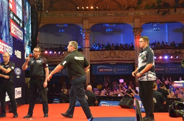 James Wade had looked really strong so far on TV but during the walk-on for the quarterfinals it seem he was not really comfaortable on the night. And really it was Gian van Veen who won the first three legs of the match. Wade found an answer throwing a 180 but somehow his accuracy on the doubles was not there and the Dutchman had a 4:1 lead going into the first break. Wade looked more settled after it and he managed to draw and finally to take over the lead but nothing looked as easy and and as natural as in his first two matches. Two times he had the chance to throw a perfect leg in the match but both times he failed. Wade stayed in front for the rest of the match, sometimes took a little break in the legs he didn't have the throw and played stronger in his own trying to keep van Veen at distance. When he was 15:13 in the lead one could see Wade definitely didn't want over time and he gave it all to get over the finishing line 16:13 - it was a good match from both players but probabyly Wade's weakest of the tournament.