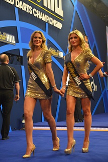 Then we of course have the walk-on girls and this year during the first round not everything run smoothly. Actually the same two blond girls were supposed to walk the players on stage the whole first round but one of the girls had an accident and sprained or broke he ankle. And so during the following afternoon session there was only one girl who accompanied a player to the steps on stage, than reverted and walked the same way with the second player. Till the evening session the PDC had managed to find a replacement, blond as well but without any experience in walk-ons and so she looked a little bit unsure during her first "stage appearances". She only stayed for two days and then was replaced by the dark haired Irish walk-on girl who had been booked for the time after Christmas anyway.