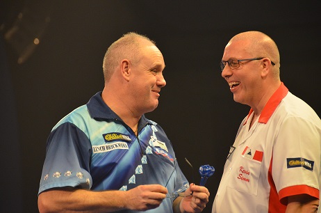 The afternoon ended with Ian White v Kevin Simm, who have a common past in the BDO. The biggest surprise of this last match was that Ian White plays with glasses now as well but he assured he doesn't wear them only because Anderson and Whitlock do so but that he really sees a lot better wearing them. The day before he even hit a nine-darter wearing them in practice. Simm played a lot better against White then against Ulang - might be because he knew his opponent. But he lost nevertheless despite hitting four 180s while White only hit two. But his hit rate on the doubles in both his matches was only around 25 - no danger for a professional like White.