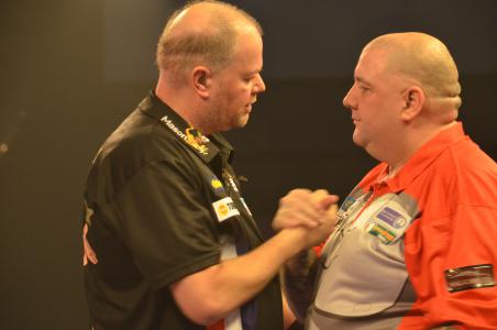 Next Brendan Dolan and Kevin Kist walked on stage. Dolan appeared in a blue and white Christmas shirt but had stayed with sparkling green flights. Not only the shirt but the match was a surprise as well as Dolan who had somehow wiggled through the Grand Slam played a really good match. As he told afterwards he by now had realised that the sport of darts was his life and he was supported in all what that means by his wife, his step children and all the family. Dolan won with 3:1 and as the other two first round matches it was a comparatively easy and clear win.