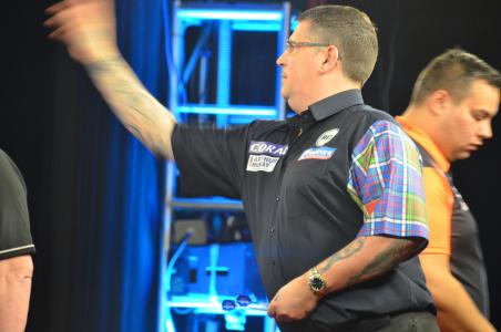 As not as many matches were played at the same time any longer and the format was longer as well I had more time to have a closer look at some of the matches. Kim Huybrechts looked quite vitalised after yesterday's win while Daryl Gurney looked more the contrary. No idea why - might be he was only bugged as he couldn't find into the match. But it was soon clear that the match would end with a Huybrechts' win. Till I had moved into the room with the three boards Michael Smith had already sent Ryan Meikle packing. Chris Dobey soon got rid of Jason Lowe as well. Only the other two matches took a little bit longer. When I left the room John Part was behind to Ron Meulenkamp. I had a short look at the Ricky Evans Gary Anderson match which was under Anderson's control from the start. When I returned to Part and co Part was interviewed - so he had won in the end.