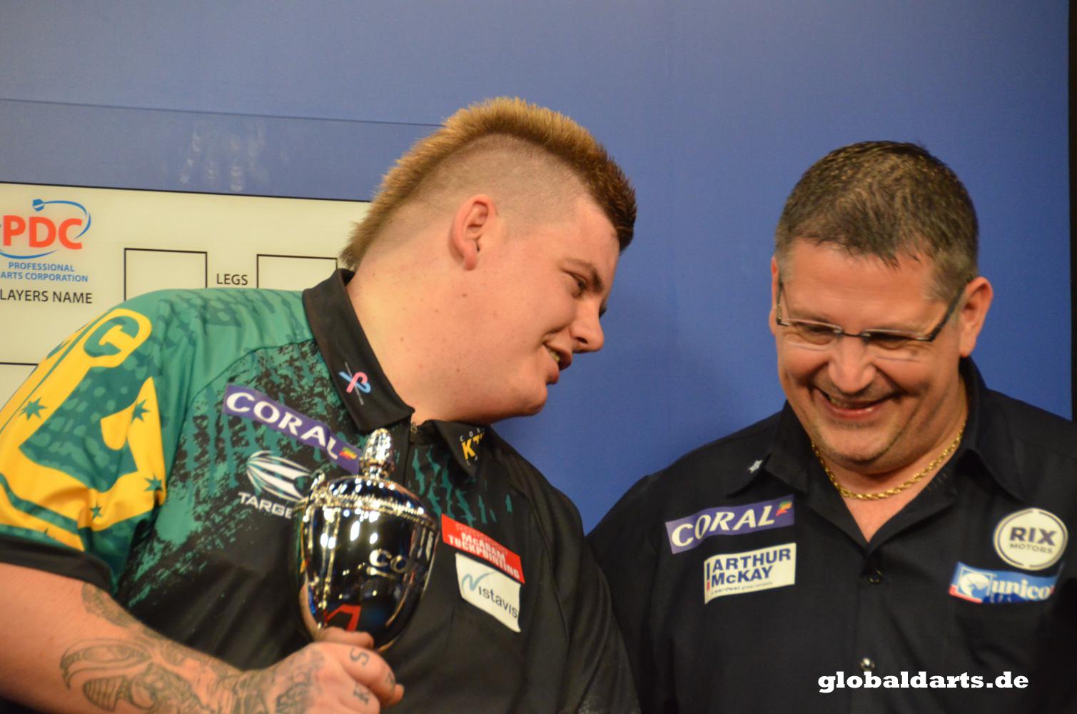 But then you could almost see how Anderson pulled himself together and took the gloves off. He rung rings around the young player and Cadby grew more and more desperate. He tried to slow down the match but had no chance at all. It looked that while throwing 180 in one of the last legs Anderson's back problems returned as Anderson tried to loosen his back between his throws. Beside he threw even faster now like he wanted to finish the job as fast as possible and only a few legs later he had won his first UK Open title. Cadby looked inconsolable and had to blink back his tears while Anderson celebrated.