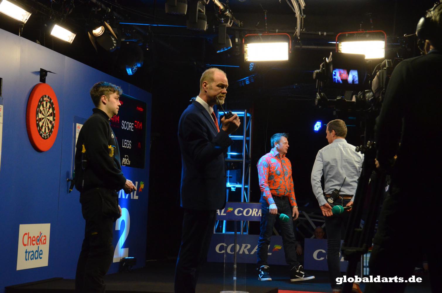 After the second semi-final the stage suddenly was full. The board was changed, a small table turned up and a person from dartconnect appeared and explained on a screen to Ned Boulting and Chris Mason how all the data is stored and how you can recall it, a young man with a cordless screwdriver watched in case the table would break down.Then ITV started to broadcast again and Boulting and Mason by now expertly explained the television viewers what the data can be used for..