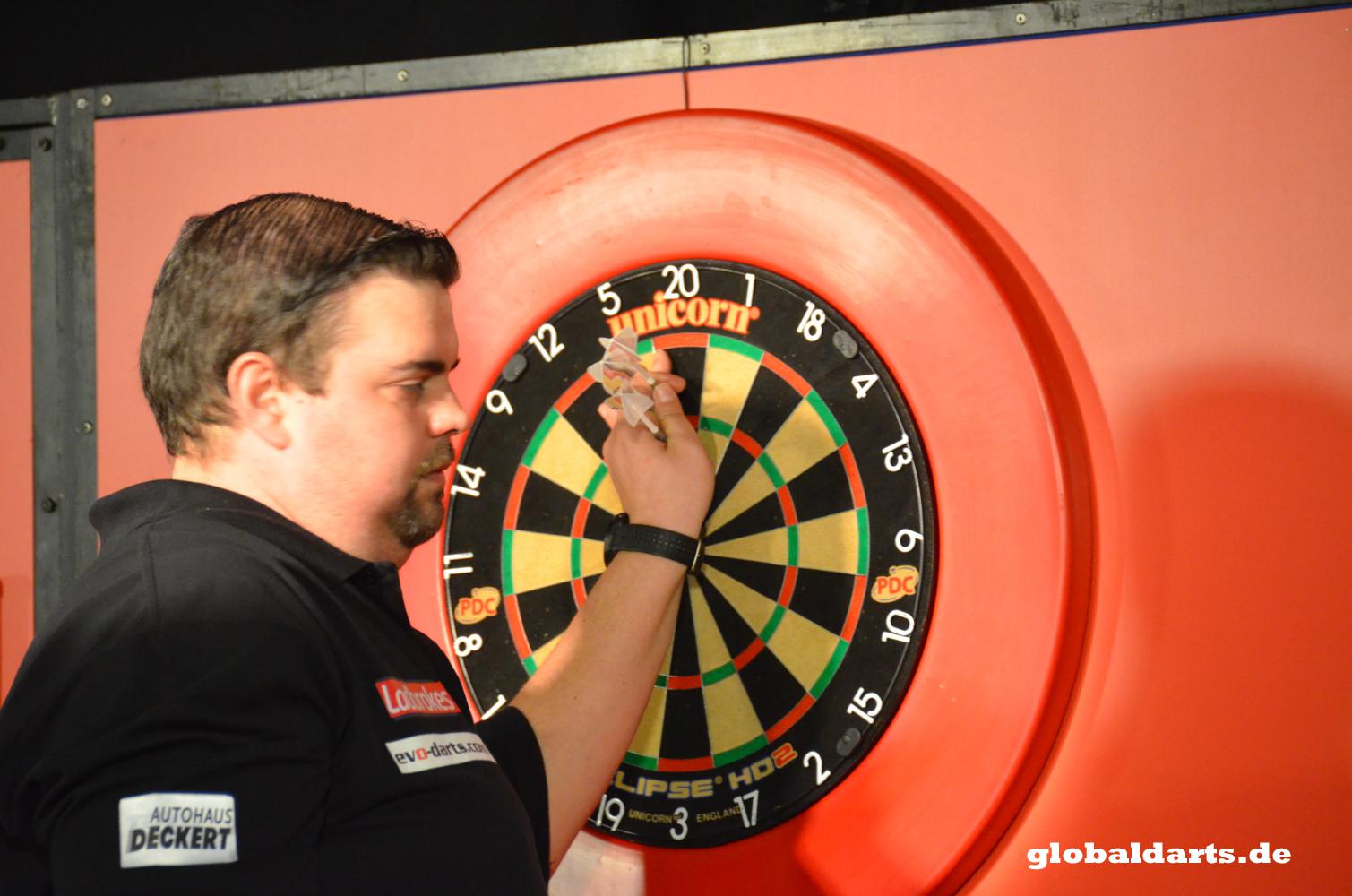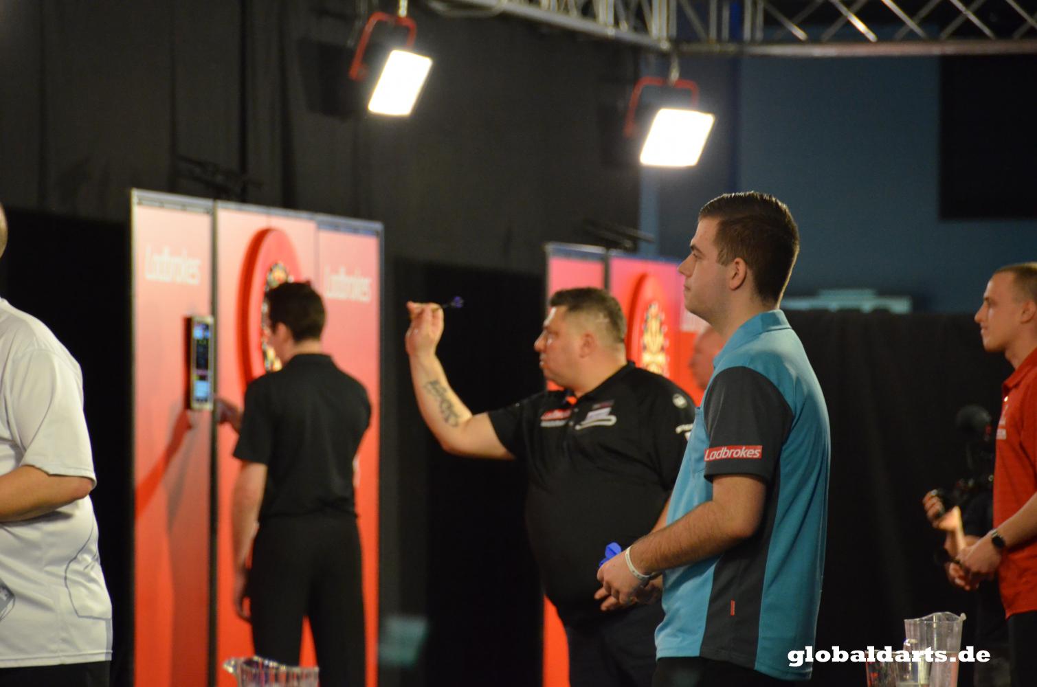 The two German players, Robert Marijanovic and Christian Bunse didn't survive their first matches either. I did see Gabriel Clemens who had no problems at all against Zoran Lerchbacher. I watched a little bit of the match between Kirk Shepherd and Bradley Brooks on the second stage which was quite a good one - and followed the thriller between Conan Whitehead and Michael Rasztovits. The first match on the main stage I spend some time with was the one between Ricky Evans and Jose Justicia - quite a close affair.