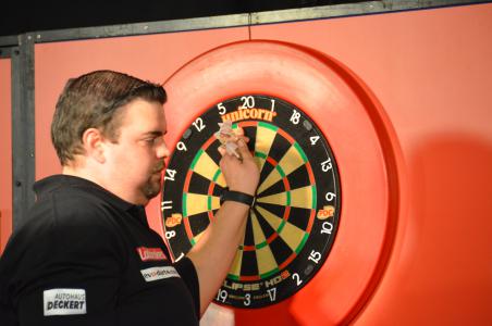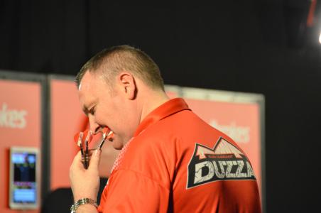 I don't know what happened after I left as I got stuck in Centre Stage for quite some time. A person had taken a fall on the steps and was treated by some paramedics - no one was allowed in or out for some time. So I watched the matches in there during that time and saw some one-sided matches with commanding wins by Madars Razma, James Wade, Kim Huybrechts, Jermaine Wattimena, Josh Payne and Jonny Clayton. When we were allowed to leave van Gerwen was out of the tournament.. At stage two the Lewis match had started which in fact was won by a Lewis - by Jamie Lewis. I didn't return to Centre stage but moved on with the crowd to the main stage where Gary Anderson just lost to Steve Beaton. It was a great match from both players but probably Anderson was a little bit rusty due to the break he had to take from darts because of his back injury. The last match of the fourth round was the match between Mensur Suljovic and Peter Wright. Wright gave it his best but it was not enough and he lost.