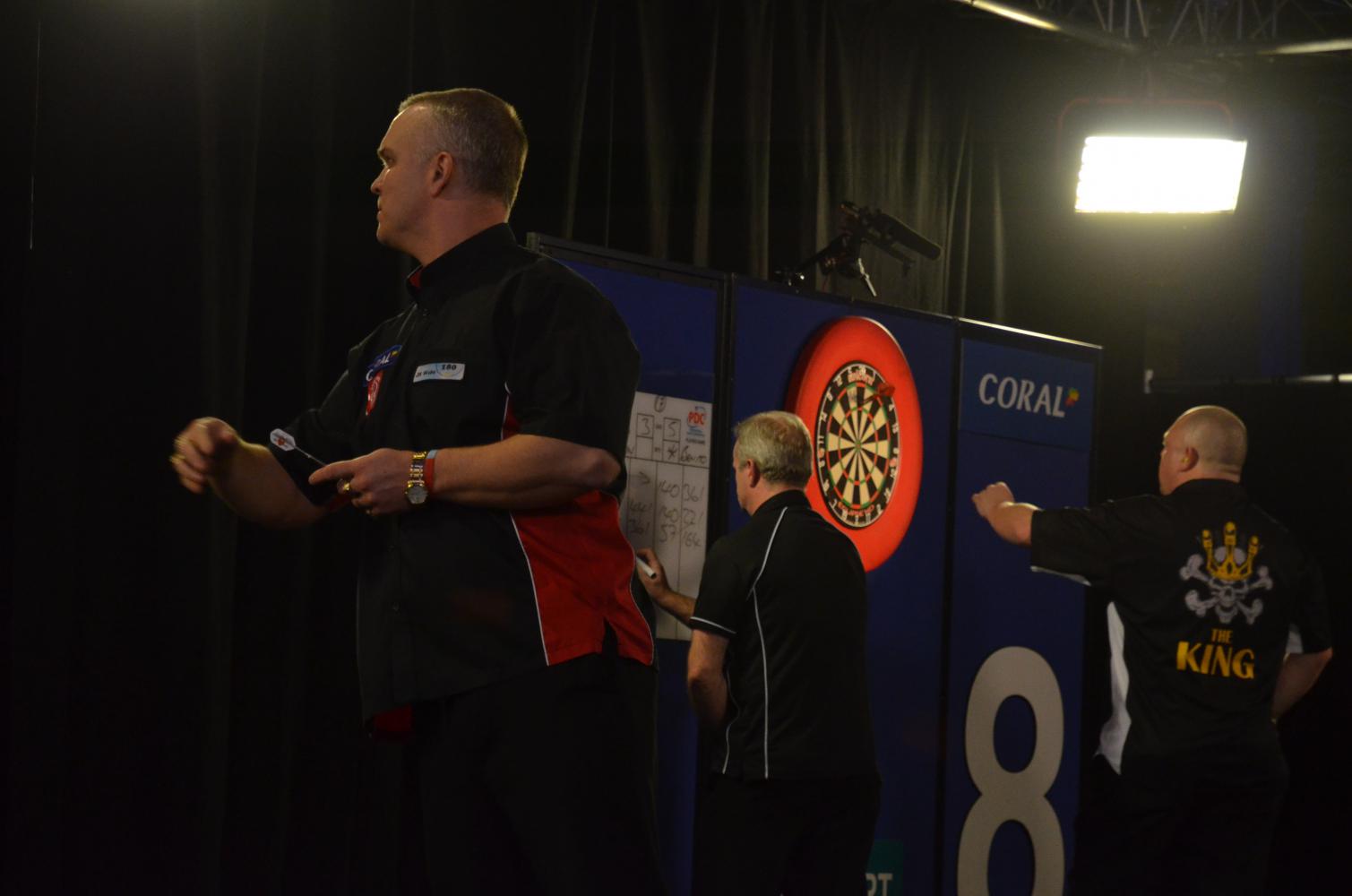 Similar experiences I made in the first day of the UK Open in Minehead when Dennis Smith and Alex Roy crossed my path. For many years they seemed to be omni present in PDC tournaments though Roy was more successful on the tour than in Major tournaments, despite him taking part from 1999 to 2012 in every PDC World Championship. Once he reached the fourth round, his best result. Dennis Smith was much more successful - he stood in the quarterfinals of the PDC World Championship in 1995, 1999 and 2003 and once - 2000 - in the semi-finals where he lost to Phil Taylor. Dennis Smith to be sure has one of the most exceptional throwing styles..
