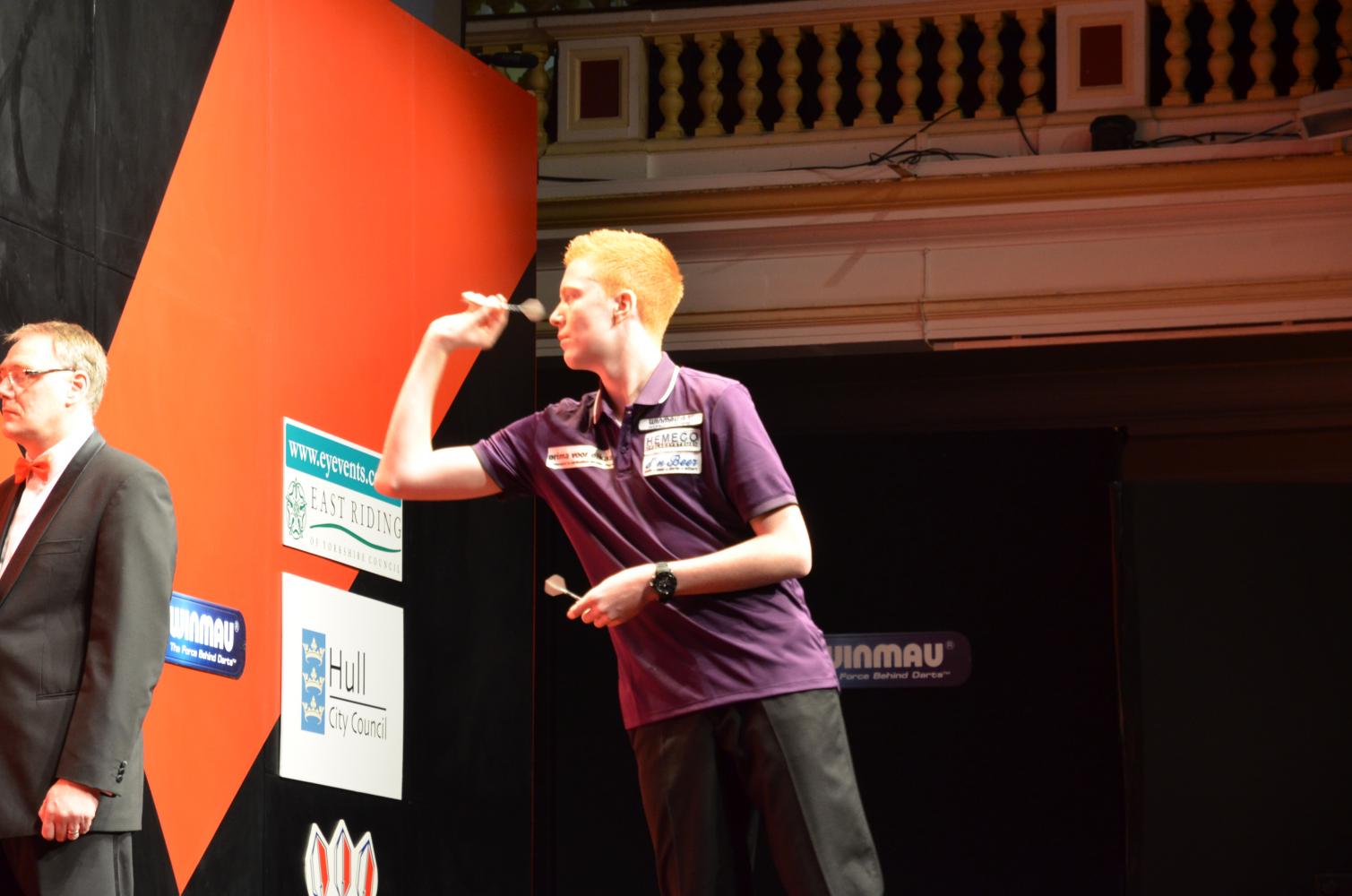 The second day in the City Hall in Hull was before me. The sun had come out again after a showery night when I started to walk down. This time a lot of young spectators were in the hall as the youth finals were played first. A lot of spectators were dressed up or did at least wear hats or glitter wigs which were sold at the BDO booth in the lobby.