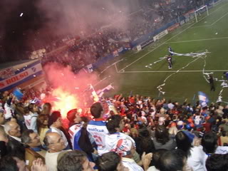 A: Well, I've seen one fight, but they have tons of cops in riot gear at the ready, and fans are separated in the stands by team. And, although they get crazy for futbol, and sometimes there's fights-especially during international matches with Argentina or big national league games-serious violence is not tolerated here-murders are extremely rare and really shamed. But, the fans often bring their own flares and fireworks to the games and play drums and wave flags and chant constantly and stuff! It's fun!
