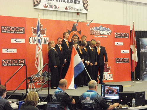 Along with a crowd of Newfoundland fans, I sat up front, with Bianca and Kathy, the lovely wives of Richard Ashdown and Jacques Nieuwlaat, the head officals and emcees. I had my camera ready, watching the live stream, ready to catch every teams proud moment. The music started as Jacques, the multi-lingual mastercaller, introduced each team and player with all due fanfare and excitement. Every team--Australia, Bahamas, Barbados, Bermuda, Brazil, Denmark, England, Finland, Germany, Iceland, Italy, Japan, Jersey, Netherlands, Northern Ireland, Norway, Ireland, Scotland, South Africa, Sweden, Switzerland, Trinidad and Tobago, Turkey, Turks and Caicos, United States, Wales--all received thunderous applause, each team lead in by a local St. John's youth player.