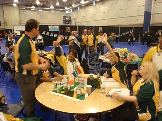 History and logic told me England would come back, slowly if not dominantly, but my gut felt something else. Team USA appeared unfazed, unflappable, and united in a zen zone. As players rotated through their match-ups, the history making began. Leg six, leg seven-America cooly takes a 5-2 lead, quietly fist bumping while the experienced Brits try not to sweat and shake heads. Leg eight, leg nine-USA 7, England 2. The crowd swelled with players and people, a colorful mob of Canadian fans and foreigners caught up in the atmosphere and intensity, each leg growing in excitement. Leg ten, America leads 8-2, one leg from a place in the finals, but perhaps more amazingly, a historic and dominant victory over mighty Team England. I was beside myself with hope.