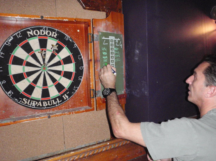 The afternoon ended, and evening began with a beautiful mauve and turquoise sunset over the pink city and warm sea. Some locals told me about some Irish bars by the yacht harbor. Maxim joined me for another quest-my kind of quest, for darts. Along the inner waterfront, between walls of sailboats and buildings, I found O'Malleys and The Shamrock. Both had one board each, though neither was seeing much use. Nonetheless, I broke out my arrows and threw some rounds. The bartender at The Shamrock played a few legs with me while waiting for other patrons to arrive. Later, I spent a couple hours playing at O'Malley's, a crowded popular place. This dartboard had its own niche between the bar and the bathroom-as people came and went, I'd offer darts to people politely trying to cross the oche with fresh washed hands. A dozen people took my offer, and more than one enjoyed that instant joy of hitting a lucky bullseye. One or two customers even stopped to play a full leg with me. Otherwise, I was simply happy throwing in France-although I felt guilty for not learning more French beforehand. I took pictures of those that played, and enjoyed a few beers until Maxim gave me the signal that he was tired and ready to return to Le Ryad for some rest.
