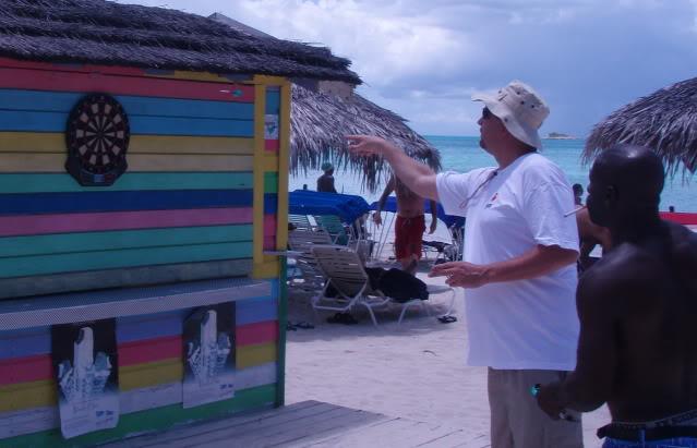 As the cruise ship slowly approached, the warm grey skies gave way and the island turned emerald, studded with colorful homes and structures, as the Caribbean water began shining its sapphire hue. This was my third visit to Anitgua, one of my favorite islands, and I knew exactly where a dartboard was hiding-in an open air bar, on the white sand beach of Dickenson Bay, a story you can read about in my old Thorn Report blog in SEWA, part 12 of "DB In the Caribbean". That story provided one of my favorite memories of tropical darts discoveries, and one of my favorite photos from all my travels-tossing darts on the beach in paradise.