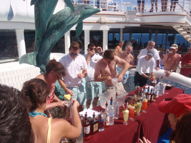 Meanwhile, I was enjoying the good life on a luxury liner: eating and drinking too much, hot-tubbing and swimming, playing shuffleboard or trivia, dolphin-watching, and, among other activities, winning the Battle-of-the-Sexes Cocktail Contest. Ok, I lost my round, but I was up against a beautiful young lady! How could I win? But, in the end, the men did reign victorious. And by now, the day before Grenada, I had a ton of fabulous new friends. Tripping the light fantastic in the sky high disco was becoming a regular nightcap.