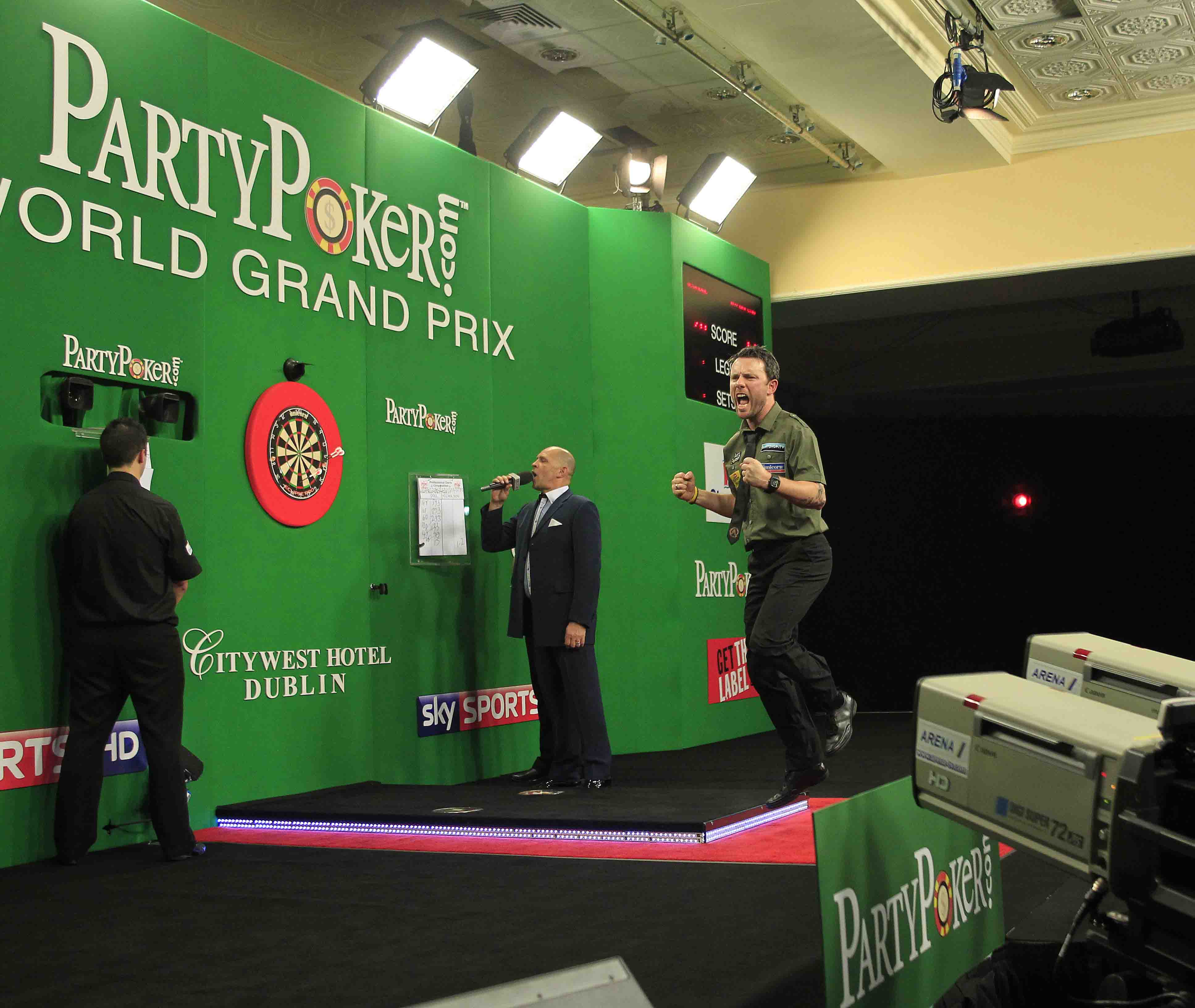 World Champion Adrian Lewis was knocked out of the PartyPoker.com World Grand Prix by Michael van Gerwen on Thursday night, as Andy Hamilton, Paul Nicholson and Wes Newton joined the Dutch star in moving through to the quarter-finals in Dublin.