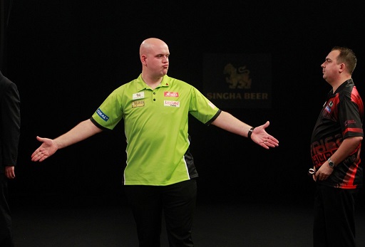 Another 180 helped van Gerwen to take the fifth, and he then sealed victory in style by finishing 130 on the bull to put one foot into the second round.