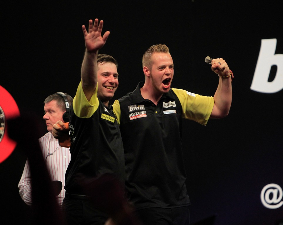 The German pair will now meet two-time champions England in Sunday afternoon's quarter-finals, with Phil Taylor and Adrian Lewis cruising past Japanese duo Haruki Muramatsu and Morihiro Hashimoto with the minimum of fuss.