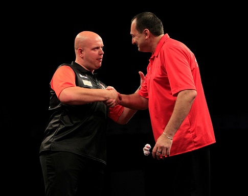 Van Gerwen averaged 103.37 and took out 148 as he whitewashed Graham Filby in under seven minutes, while van Barneveld opened his game with flamboyant Devon Petersen with an 11-darter and averaged 99.93 in a 4-1 triumph.